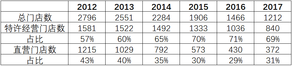 与营收同步的下降的是门店数量,几乎以1天关闭1家关店的速度瓦解。