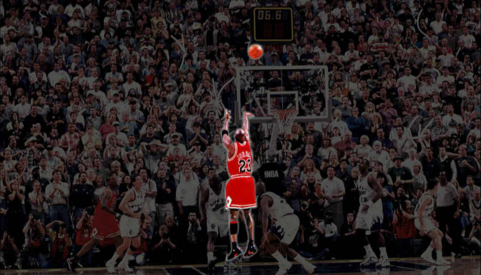 终场前45秒,卡尔-马龙左翼接球,背对丹尼斯·罗德曼。公牛包夹,马龙回头,望向弱侧45度角三分线外,甩出一记长传。斯托克顿接球,起跳,一记三分球。