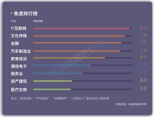焦虑排行榜上,IT互联网、文化传媒和金融人排名前三,他们工作起来如赴战场,又如同一支紧绷的箭随时待发。