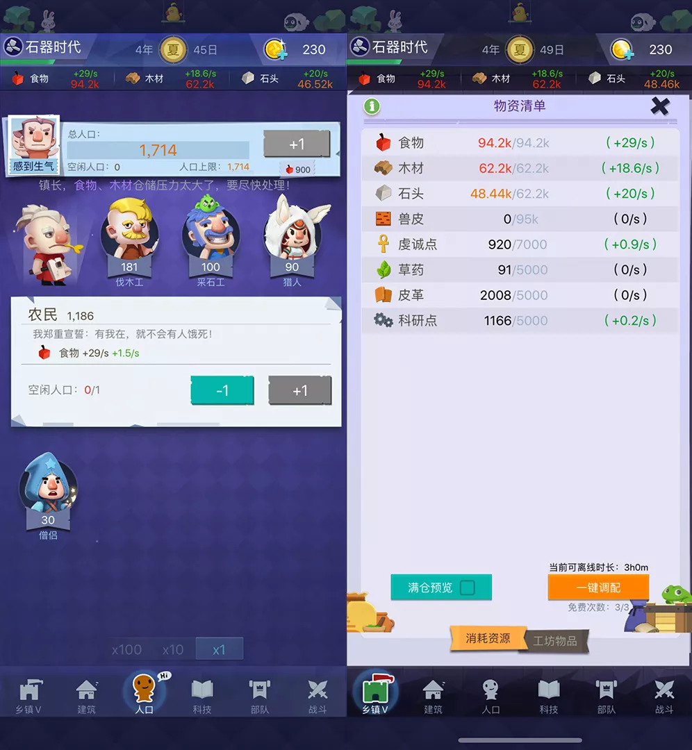 因此,在游戏中期如何合理地配置离线获取的资源,则成为了玩家的一道烧脑算术题。在体验上,玩家需要在每次下线前进行资源调配,以应对游戏往后的发展所需。