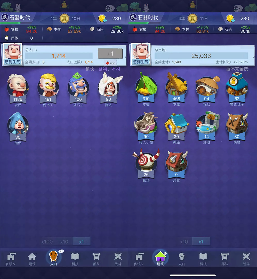 在这个阶段,玩家的成就感很大程度来自于通过点击屏幕获取资源,以及使用资源推进游戏进度的过程。这个简单的循环也呈现了放置类游戏的核心玩法,但在度过短暂的前期后,《文明大爆炸》却在玩法上进行了过渡。