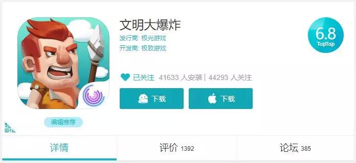 今天,腾讯极光游戏代理的一款放置类模拟经营产品正式上线。这款名为《文明大爆炸》的游戏,截至发稿前在TapTap的1300+评价中拿下了6.8分,比上线前获得的8.7分下降了不少。