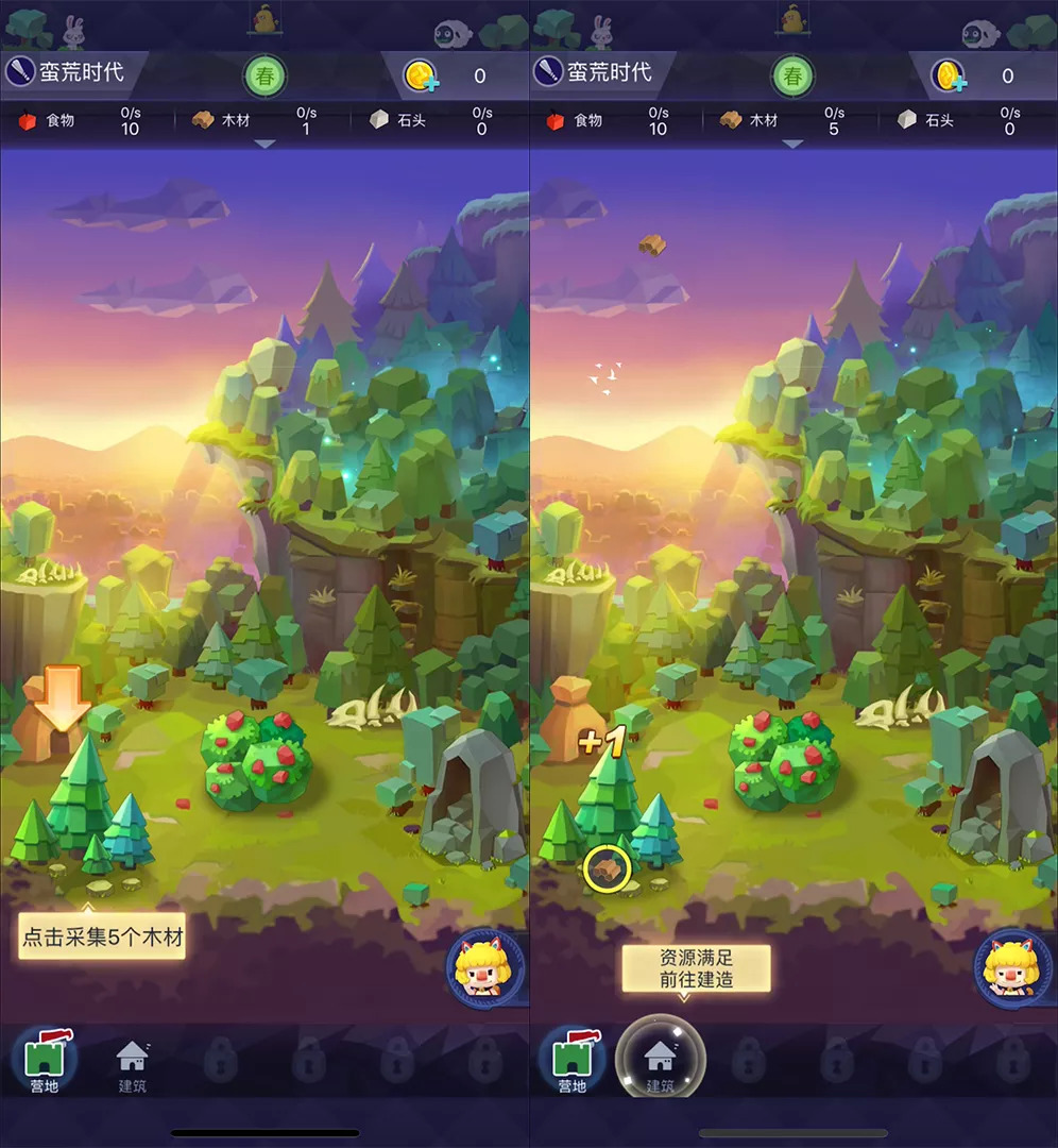 在游戏前期,《文明大爆炸》与普通的点击游戏无异,玩家通过点击相应位置获取资源。主界面上的树木、果树和洞窟分别对应木材、食物和石头三种资源。手速越快,获取的资源越多。