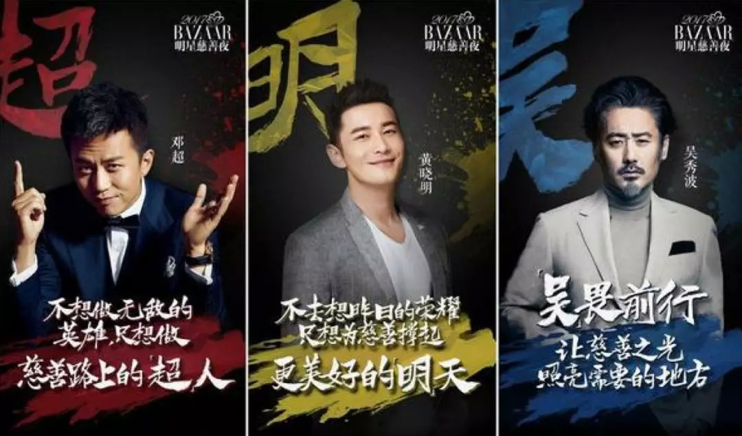 慈善夜的男明星方面就稍显单调。除了2013年成龙大哥左手范冰冰、右手李冰冰、前面还一个安以轩比较高调之外。基本是以黄晓明、陈坤、邓超这些华谊的男星为主,直到流量时代到来,鹿晗、张艺兴、tfboys这些新人才开始大放异彩。