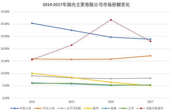 中国人寿在国内寿险市场龙头老大的地位短期内难以动摇,但其增长势头已放缓。较之中国平安在寿险市场稳定的15%-17%份额,中国人寿的寿险市场份额已从2014年的30.38%下降到2017年的23.88%。