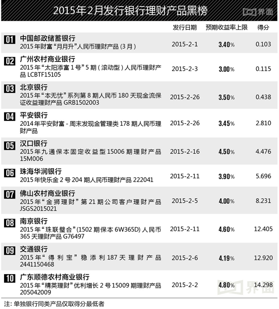 黑榜中,中国邮政储蓄银行的2015年财富“月月升”人民币理财产品(3月),表现得不尽如人意。这款为期30天的产品,销售期从2月1日到27日,竟然长达26天,其预期收益率上限却仅为3.4%。虽然投资标的为风险较低的债类及票据,然而其不保本且浮动收益的属性使其在同样收益率区间的理财产品中不占优势。真不知道那些2月初就购买该产品的客户在拿到收益后是什么心情……