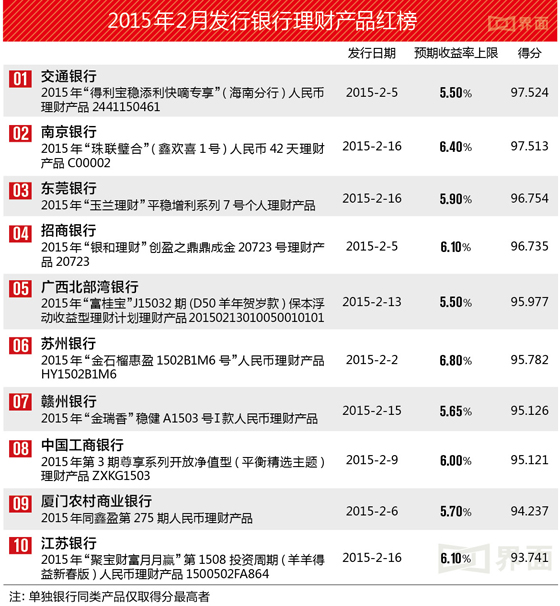 每个月,界面新闻都会根据自己制作的一个涵盖数万只理财产品的数据库,对当月理财产品进行评估与排行。该数据库可以在银行间比较,也可以在衡量流动性、宏观经济等风险后挑出性价比最高和最低的产品,其挑选范围是全国范围发售的信息披露充足的非结构类理财产品,最终形成当月产品红黑榜。