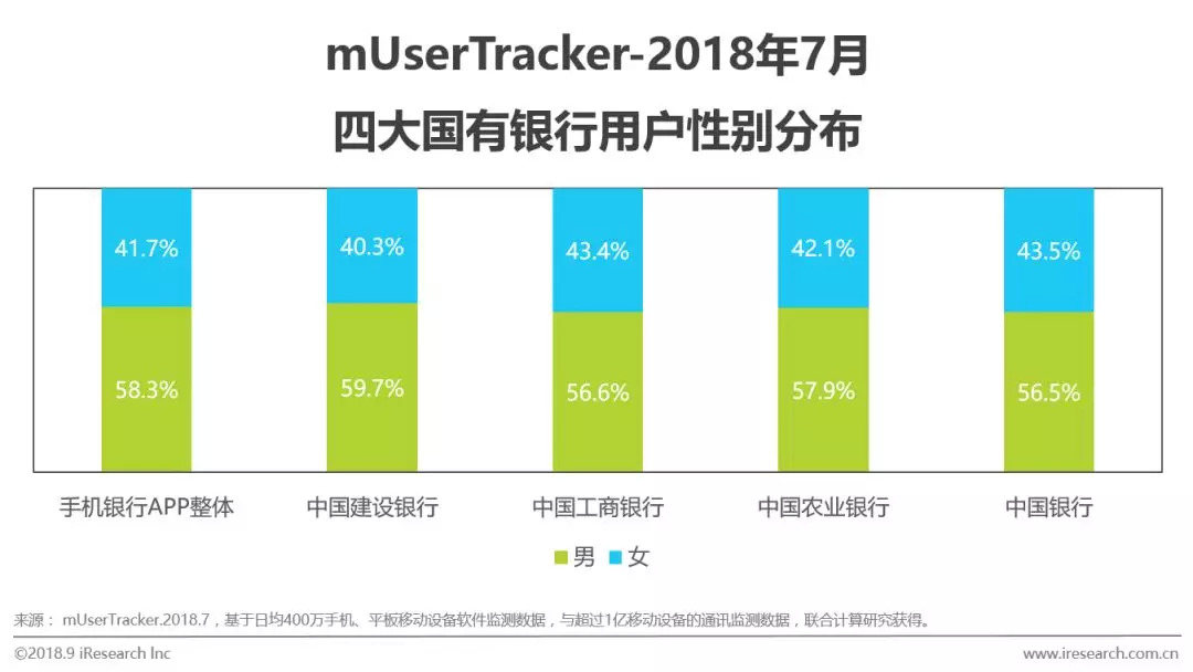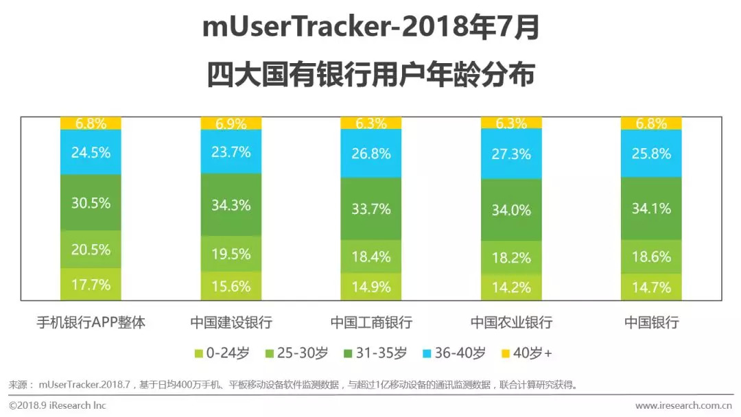 四大国有银行APP用户性别和年龄分布符合手机银行APP整体情况。从性别来看,男性用户接近60%,高于女性。从年龄分布来看,有较稳定的经济来源的中青年是手机银行APP的核心用户群,31-35岁用户最多,占据30%-35%,而40岁以上用户占比最少,不足7%。