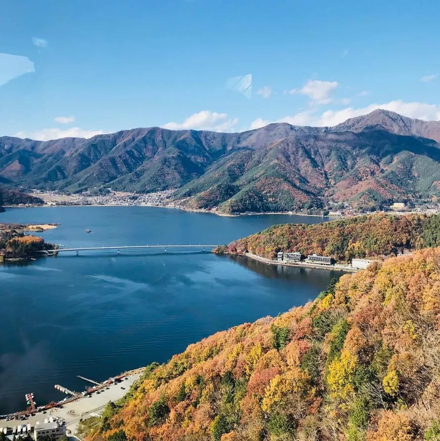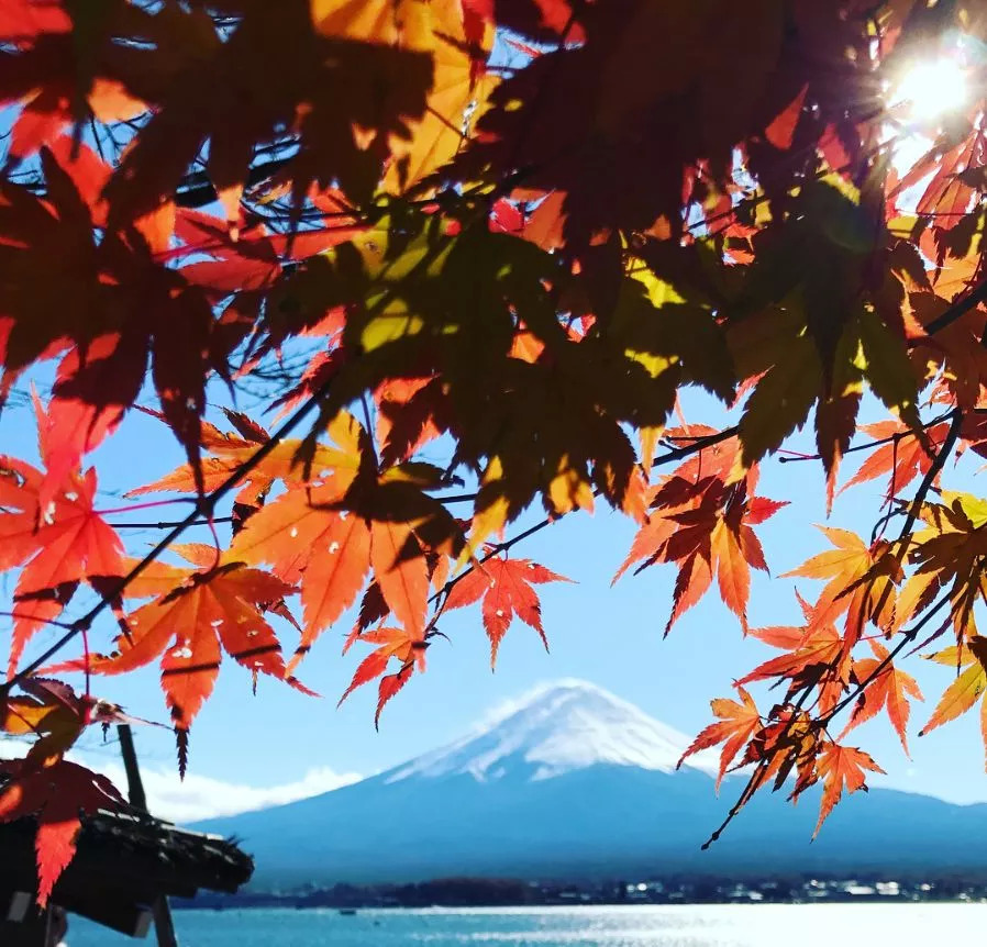 红叶时节,河口湖两岸枫叶妖娆,与湖对岸白雪掩盖下端庄的富士山形成鲜明对比,让人陶醉其中。