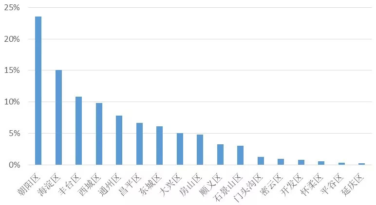 ▲ 图1 2018年二季度北京市各区租赁住房挂牌量占比