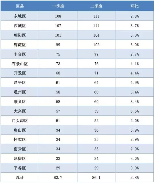 整体来看,北京市二季度平均租金为86.1元/平方米·月,比一季度的83.7元/平方米·月上涨2.8%。