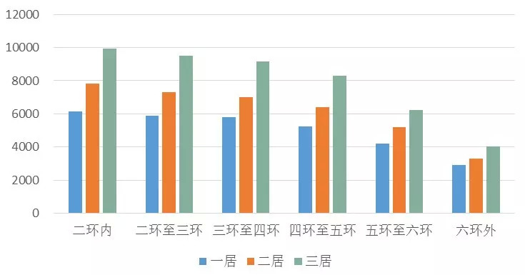 从各居室整套住房租金价格来看,各环线差异较大,以一居室为例,4000元以下月租金的房租,主要集中在五环以外。
