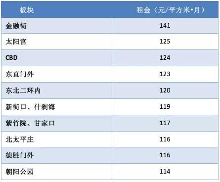 从板块来看,位于西二环,作为首都金融主中心区的金融街板块租金水平遥遥领先,高达141元/平方米 月。而位于远郊区县的各个板块由于地理位置差,租金仍处于相对较低水平。
