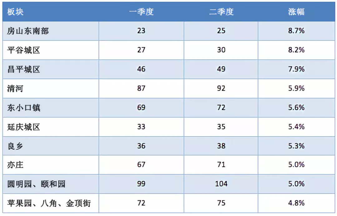 以上板块是北京市二季度租金涨幅较大板块,近郊区县:房山、昌平、大兴等较靠前。