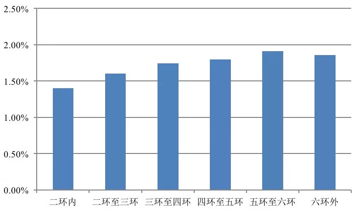 从环线来看,二环内的租售比仅为1.4%,其他环线在1.6%-1.9%。