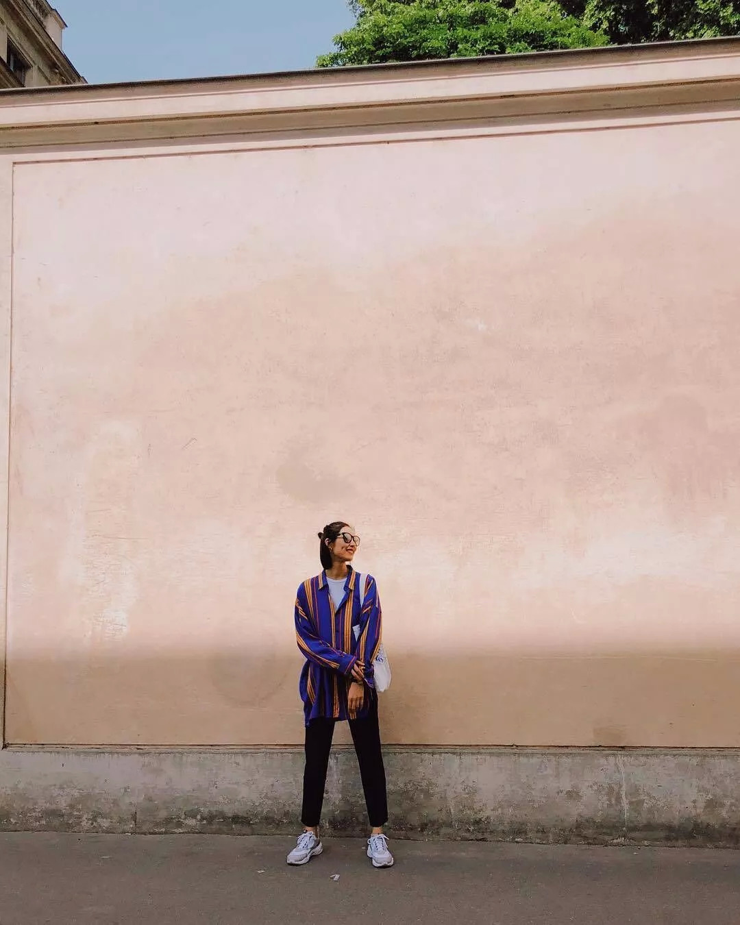 帅气girl则可以学大表姐选择oversize的彩色条纹衬衫,内搭一件白T就能直接出门,自带的慵懒气息简简单单slay全场。