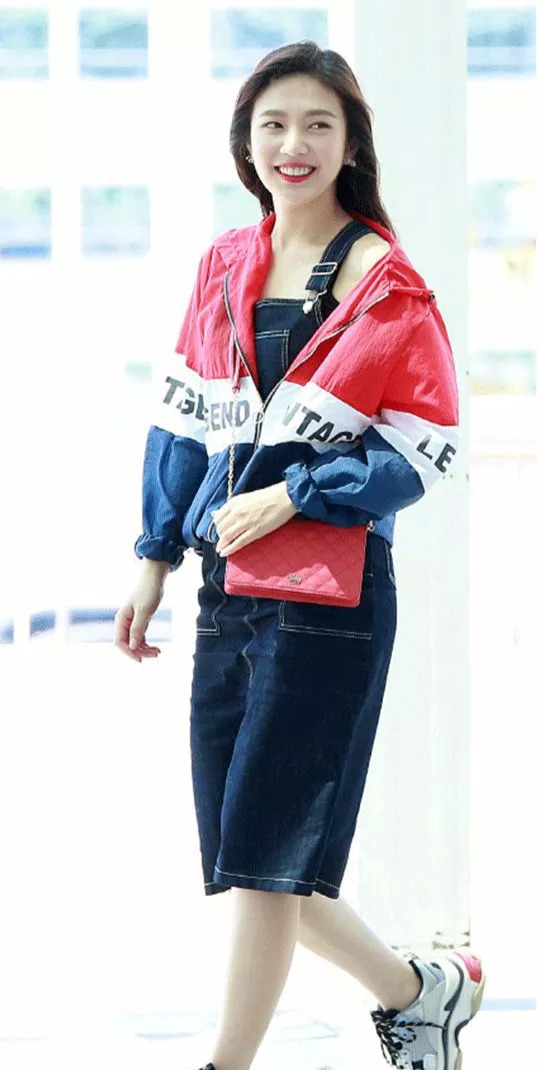 背带裙也可以直接单穿,学Joy加一件运动风外套,酷劲满满。