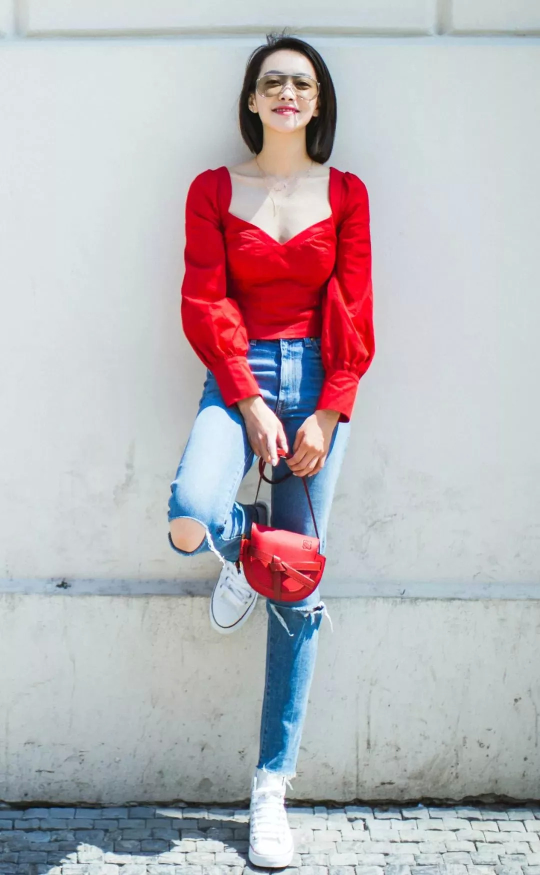 将衬衫塞到同色系的牛仔裤之中,让整个人显得无敌修长。