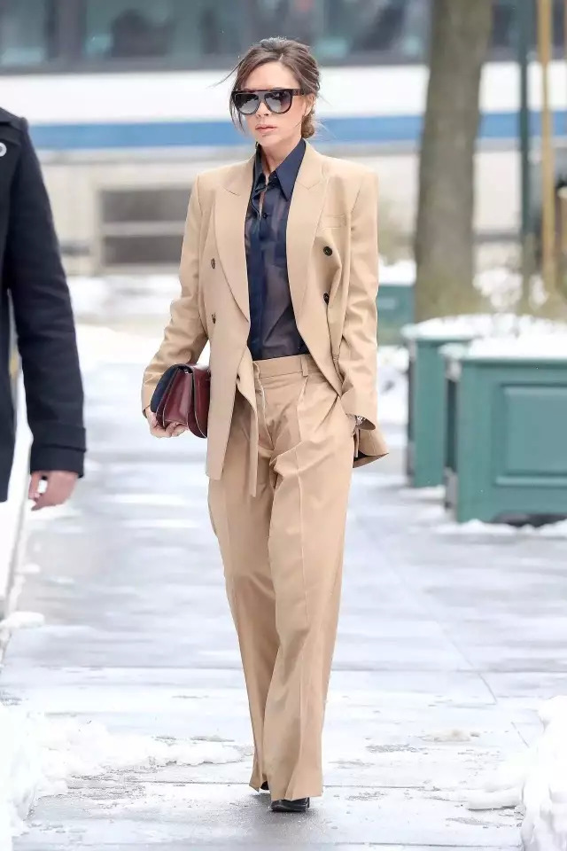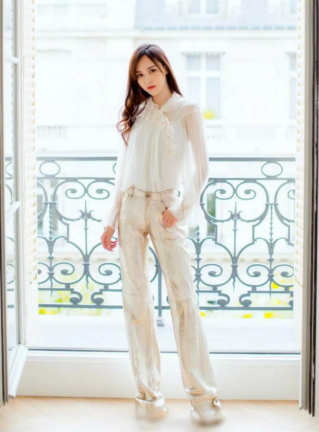 如果你不想这么有女人味,可以学唐嫣搭配一条较为硬朗的阔腿裤,柔美与帅气平衡得刚刚好。