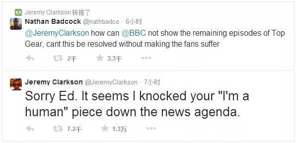 Jeremy对这事不表态吗?2young2simple!作为一名口无遮拦的资深人士,他回应了一句:“Sorry Ed. It seems I knocked your ‘I'm a human' piece down the news agenda.”,大意就是向工党领袖Ed Miliband致歉,因为他抢了Miliband近期选举应该上的报纸头条。