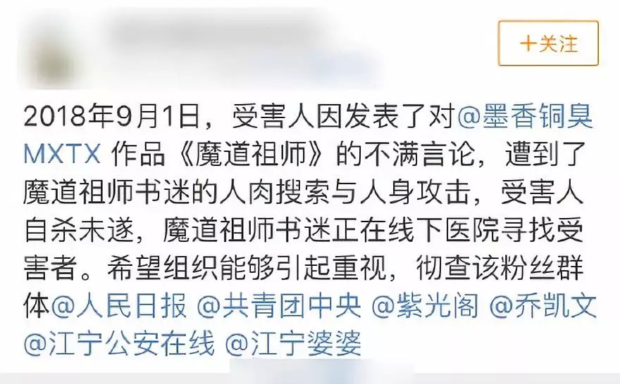 9月1日,有网友爆料:《魔道祖师》作者“墨香铜臭”的庞大粉丝群中,有一名初中生铁粉。不久前,她发现自己的初中老师竟对墨香铜臭和《魔道祖师》有所非议。为了维护偶像,这名初中生开始跟踪窥探老师,拍照片、记地址,进而通过电话、网络加以威胁。不堪骚扰的老师最终选择自杀,但幸好被成功抢救。