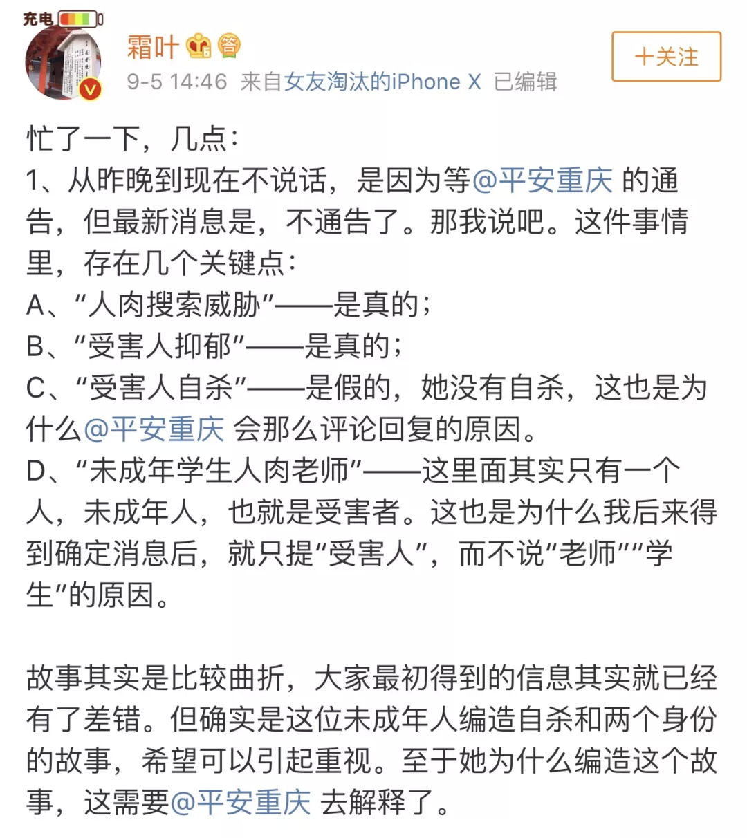 9月5日,事件再次反转。初步认定“初中教师遭人肉自杀”新闻为某未成年人编造的谣言,但人肉搜索确有其事。目前,最初爆料人霜叶(网名)也在被人肉攻击,并正式向警方报案,后续事件还在持续发酵。