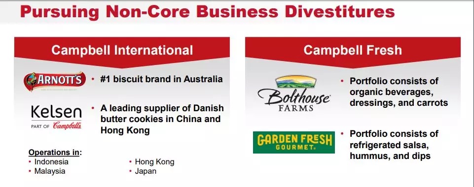 在食品巨头们在全球范围内“买买买”的时候,为什么金宝汤却在“卖卖卖”呢?对此,Keith McLoughlin给出的答案是:金宝汤必须成为一家更专注的公司。