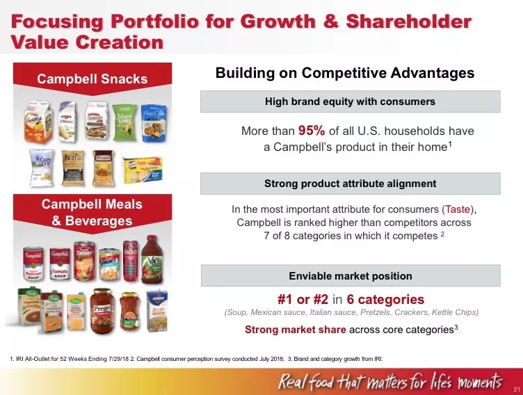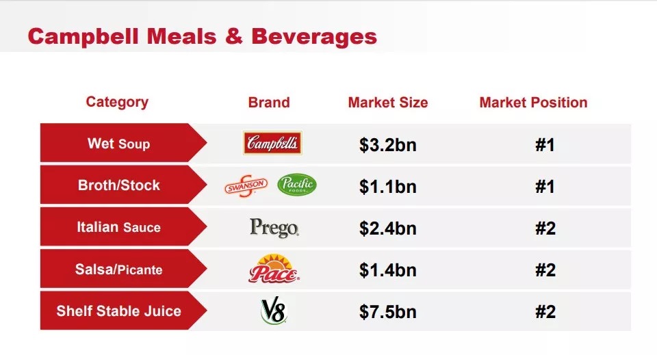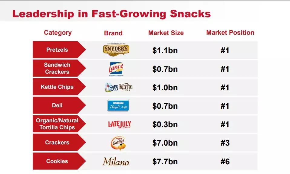 金宝汤如此重视“大本营”也不无道理。该公司的会议资料显示,其大多数的零食以及包装餐饮品牌的规模均处于美国市场前二的位置。