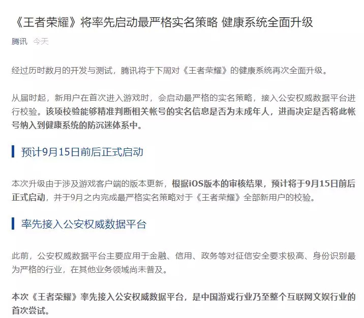腾讯在公告中表示,9月15日前后,官方将对《王者荣耀》健康系统全面升级,新用户首次进入游戏时,会接入公安权威数据平台进行未成年人校验,进而决定是否将此帐号纳入健康系统的防沉迷体系中。9月之内完成最严格实名策略对于《王者荣耀》全部新用户的校验。