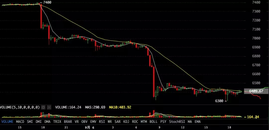 最终,比特币报出6300美元的今日最低价,较昨日高点7418美元,跌去了15.1%。