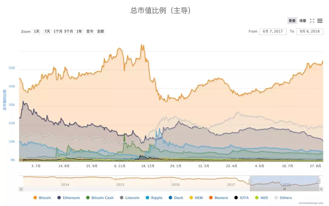 值得关注的是,尽管与历史高点相比,当下的比特币价格长期在低位徘徊,但比特币市值占数字货币总市值的比例,却在不断提升。