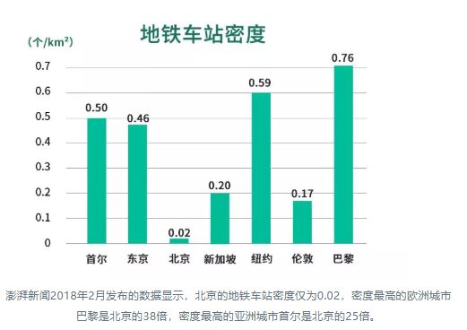 澎湃新闻2018年2月发布的数据显示,北京的地铁车站密度仅为0.02,密度最高的欧洲城市巴黎是北京的38倍,密度最高的亚洲城市首尔是北京的25倍。