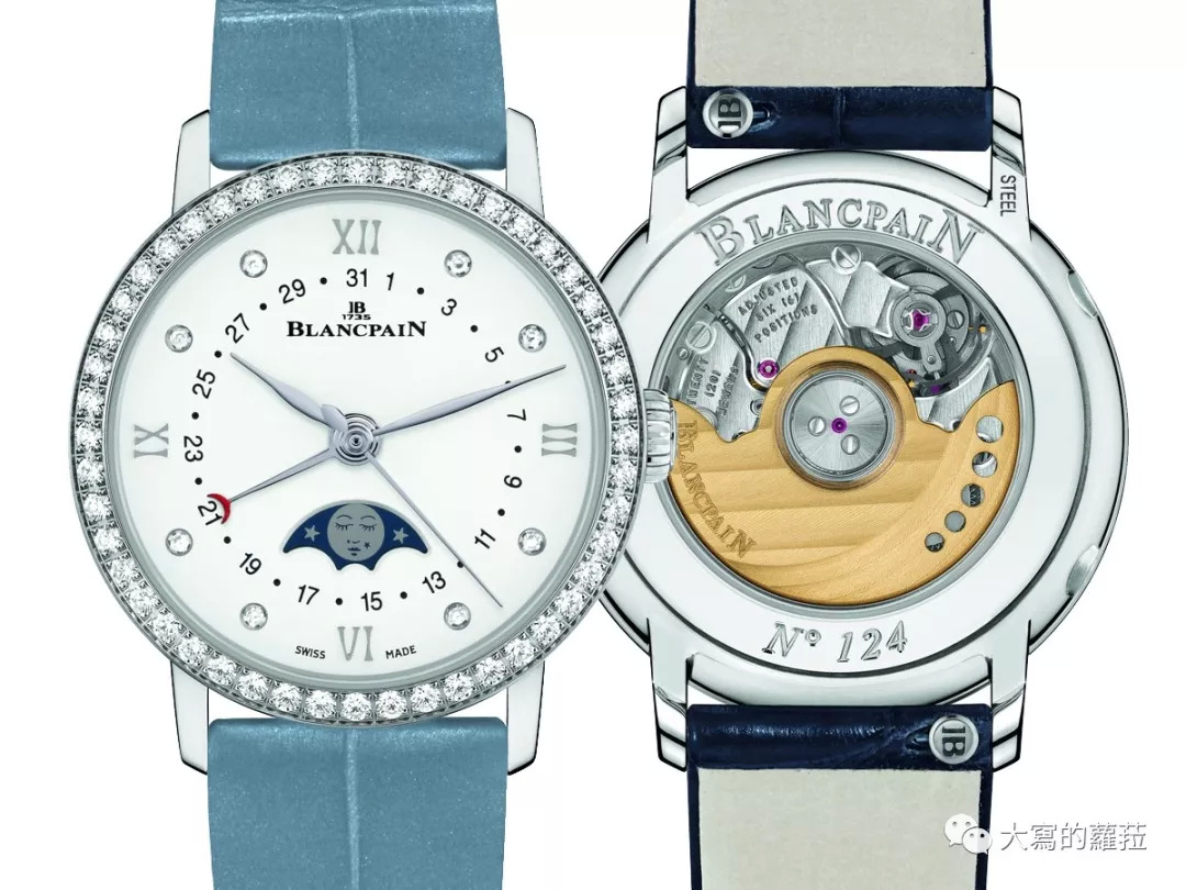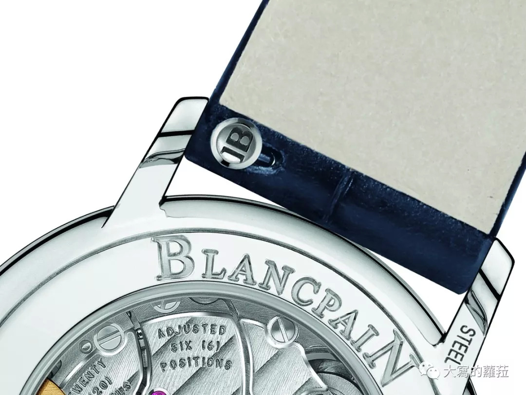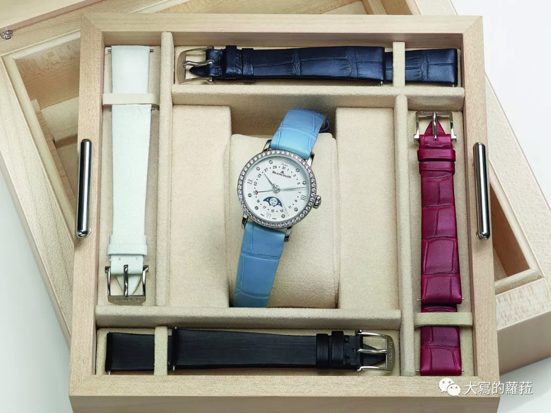 因应女性喜爱求变的需求,宝珀也有推出过搭载简易皮带更换系统的Villeret经典系列日期指示月相套表,一次搭配了五条不同材质与颜色的表带供使用更换,一表多戴且操作简单。宝珀的表带快拆将传统表耳拴弹簧结构上设计了较大的按钮,方便按压使操作更为简便,对长指甲的女性而言便无须担心会抠坏美美的指甲。