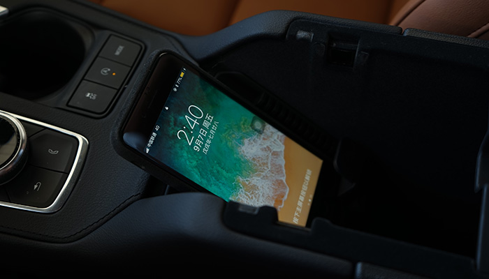 第三是扶手箱内带限位调节装置的无线充电装置,配合一个USB和两个12V电源,前排的大问题充电彻底解决;