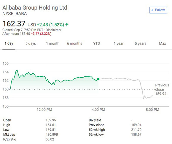 受到马云消息的影响,阿里巴巴盘后最高跌幅3.77%,目前已经回升。