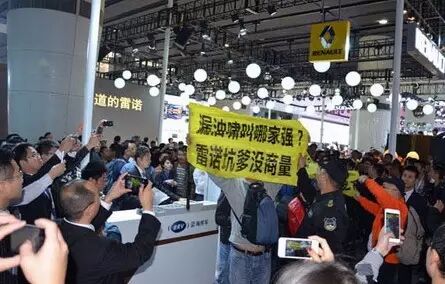 事件:在2014年年底的广州国际车展上,有几名雷诺车车主举着“漏油啸叫哪家强,雷诺坑爹没商量”的标语抗议其车的变速箱漏油,迎来大批媒体和观众的围观。在拉扯间,这几名“维权车主”才被几个穿着制服的保安带离现场。