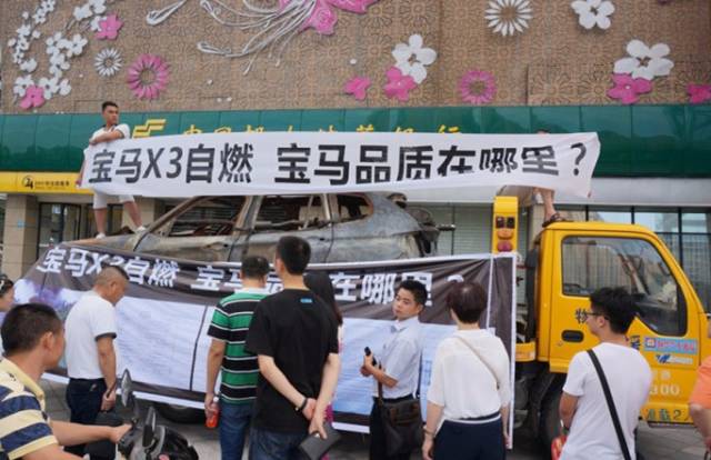 事件:在2014年的成都车展展馆外,有两名男子把自己已经自燃烧坏的宝马汽车架在救援车上站在救援车上,并举着“宝马X3自燃,宝马的品质在哪里?”条幅,以示抗议。大致原因是因为宝马的技术鉴定专家认为汽车的自燃是因为进水引起的,但是车主却坚持表示自己在事故之前汽车从未被谁淹过也没有过涉水渡河,不存在专家所作出的判断。