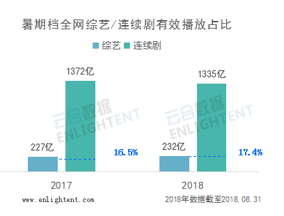 从网播量大盘来看,云合数据显示,综艺节目从去年的227亿提升2.2%至232亿、略有增长,剧集市场虽有《延禧攻略》这样的爆款,总体网播量却从去年的1372亿下滑2.8%至1335亿。综艺市场呈现出了增长态势,但仍旧难以与剧集抗衡。