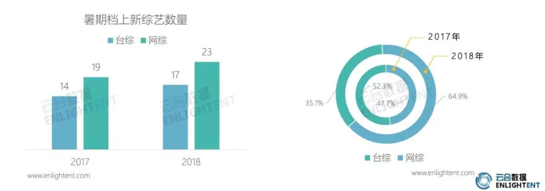 内容与观众的同时转移后,网综的上新数量开始高于台综,去年和今年的上新占比均维持在58%左右,网络平台的自制节目则由去年的9档增至18档。从有效网播量来看,去年暑期的上新网综还仅占47.7%,今年却直接反超台综,达64.9%。