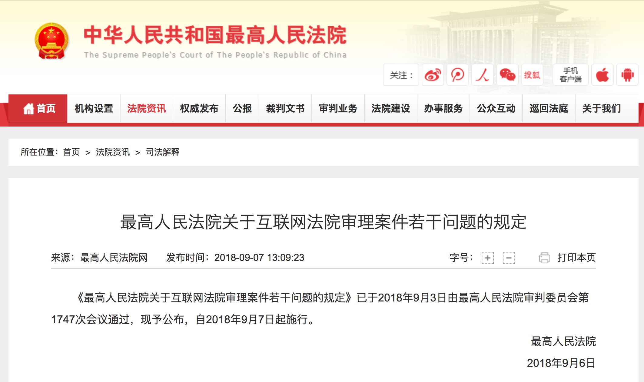 2018年9月6日,最高人民法院发布《最高人民法院关于互联网法院审理案件若干问题的规定》(法释〔2018〕16号,下称《规定》),明确互联网法院集中管辖所在市的辖区内应当由基层人民法院受理的特定类型互联网案件,“互联网购物、服务合同纠纷”,“互联网金融借款、小额借款合同纠纷”等都包含在内,并对上诉机制和诉讼平台建设,以及在线诉讼的身份认证、立案、应诉、举证等诉讼规则作出一系列规范,《规定》于9月7日正式生效实施。