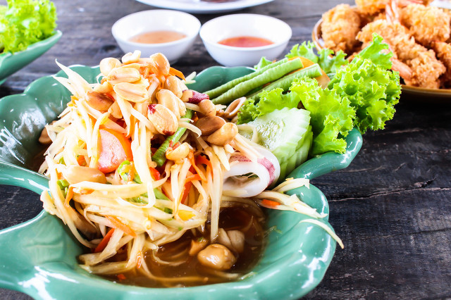 青木瓜沙拉本是泰东北的民间美食,因其酸爽可口,又低脂健康而被泰国人民广泛接受,成为泰国最普遍最热门的食物之一。街头巷尾也常可见制作青木瓜沙拉的摊贩。青木瓜丝、番茄、豆角、小红椒、蒜米、鱼露、虾米、椰糖、柠檬汁等,依次加入对窝用木槌边捣边拌即可。尝一口,口感清爽,果味浓郁,味道可酸辣,也可酸甜。