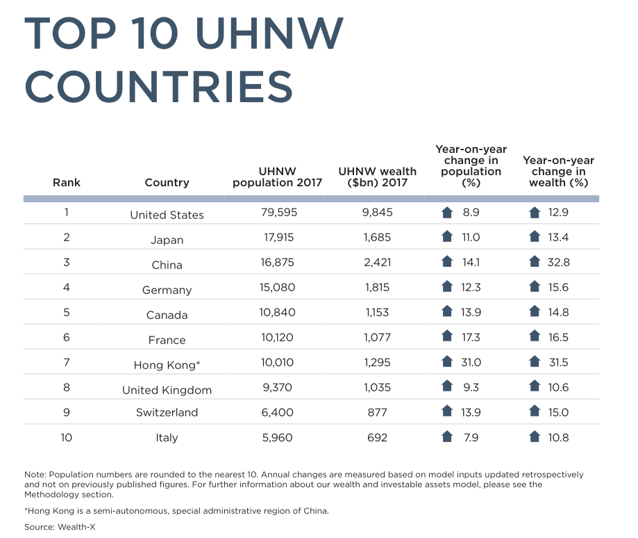 《2018年世界超值财富报告》显示,美国拥有世界上35%的超级富裕人口,其财富总额超过10万亿美元。日本排名第二,中国紧随其后,冲进前三强。