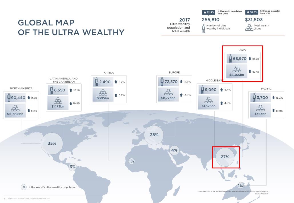 根据《2018年世界顶级财富报告》表明,去年全球顶级富豪数量增长了13%,而亚洲顶级富豪数量增长了18.5%,总财富增长了26.7%,是美国的两倍。