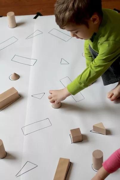 还有参考七巧板的玩法,家长先把图形画好,让孩子来摆放。