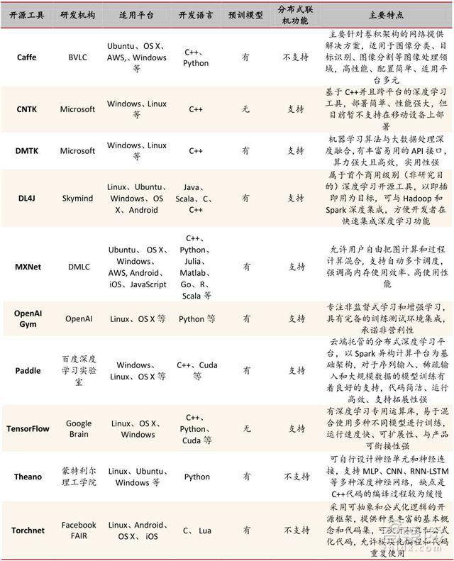 如前所述,软件框架是整个技术体系的核心,是算法的工程实现。当前,人工智能基础性算法已经较为成熟,各大厂商纷纷发力建设算法模型工具库,并将其封装为软件框架,供开发者使用。