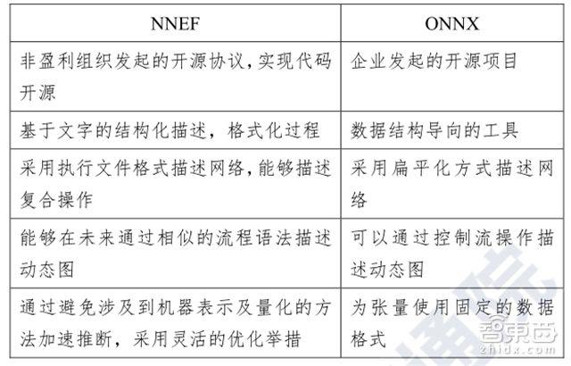 第二阵营是 Neural Network Exchange Format(NNEF,神经网络交换格式),是由 Khronos Group 主导的跨厂商神经网络文件格式,计划支持包括 Torch, Caffe, TensorFlow, 等几乎所有人工智能软件框架的模型格式转换,目前已经有 30 多家计算芯片企业参与其中。