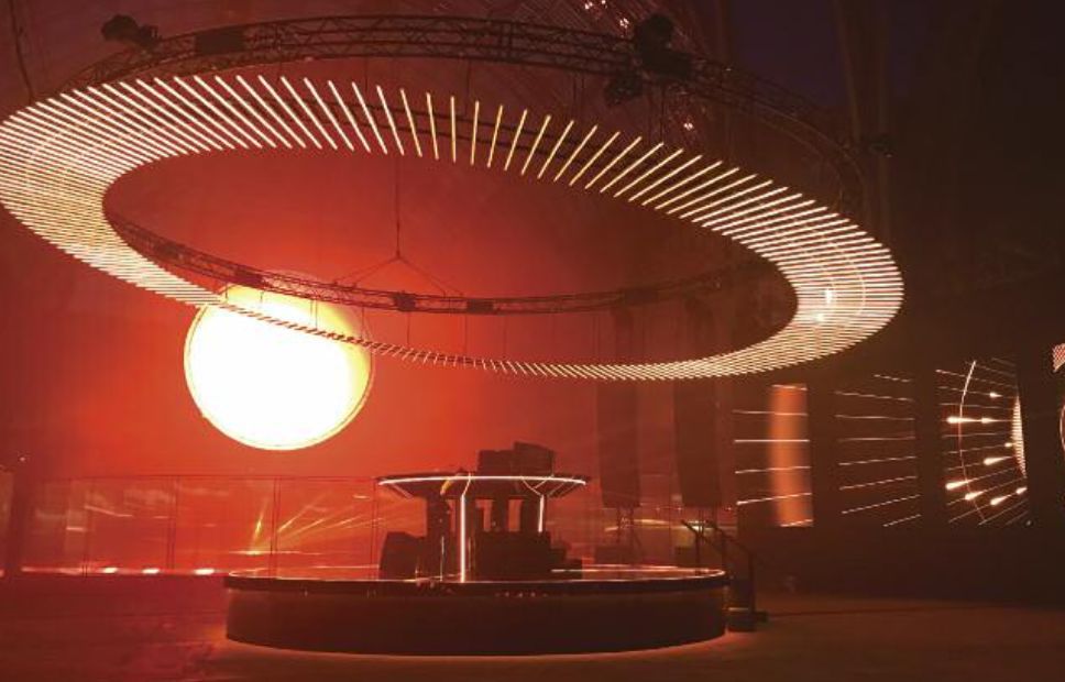 “我们还用Martin Atomic频闪灯、 200多个Arri SkyPanel和60多盏Sunstrip 灯做出了闪烁的光效。”史密斯接着说。他又补充,“我们还有非常好的投影仪、视频墙以及激光——七面巨大的Unilumin 3.9mm LED视频墙、六个Tripan激光灯和四个30000流明的 Panasonic投影仪,这些都是由ITR London的克里斯·柯克思(Chris Cox) 提供及安装的。我们设计并定制了一 个直径50英尺的桁架,用以悬挂一大型灯光环,该灯光环布置在DJ台的上方,由超过200条6英尺长的荧光灯管组成,由灯光控制台控制。”史密斯说,“灯管排布的形状就像自行车辐条,或者说像马车的车轮。”