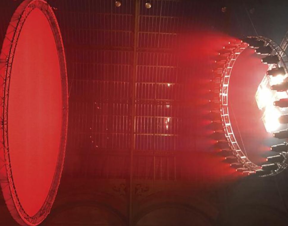 巴黎大皇宫内,哈迪希望将身负渗透任务的秘密特工们参加一场派对的场景,呈现出阳光照射的效果。史密斯解释道:“最后我们把直径50英尺的环形桁架竖置于大皇宫内,上面铺着一张暖调电影银幕材质的柔光布。然后我们将另一个特殊设计、建造并经过重量测试的桁架如同钟面般悬吊起来,放置在银幕后方一定距离处。我们又在这个桁架上安装了36盏 Robe BMFL Blade移动灯光。”光控台操作员丹·沃尔特斯(Dan Walters)将所有移动灯光调至最亮,并给它们加上轻微的漫射效果,以抵消其光束角 度产生的椭圆形,再将它们指向那块银幕。