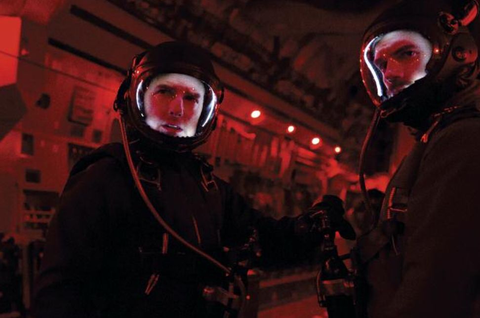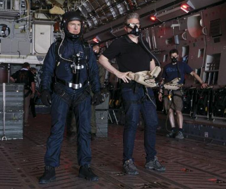 HALO跳伞片段不是一镜到底拍摄而成,而是分三段逐一拍摄。彭弗德认为第一部分最为复杂。这一部分拍摄亨特在机舱内,朝着敞开的舱门奔去,预备跳伞,试图跟上沃克。“这时克鲁斯朝掌机方向跑去,然后两人双双跳伞,掌机是倒退着跳出去 的。”彭弗德解释道。