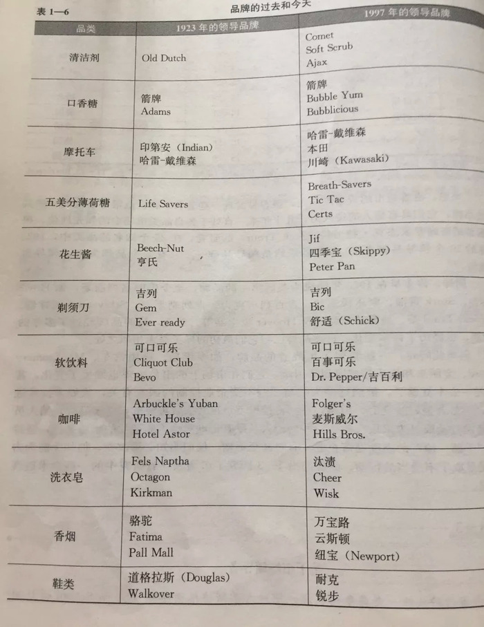 Golder 评估了100个品类中的650个产品,并且比较了1923年和1997的品类领导品牌,发现100个品类仅有23个在1997年还保持领导者的位置。另外,1923年的28%的领导品牌在1997年已经销声匿迹了,这种情况在服装和时尚类产品中表现最为明显。而食品、饮料行业相对要好些,仍有39%的品牌保持领先。